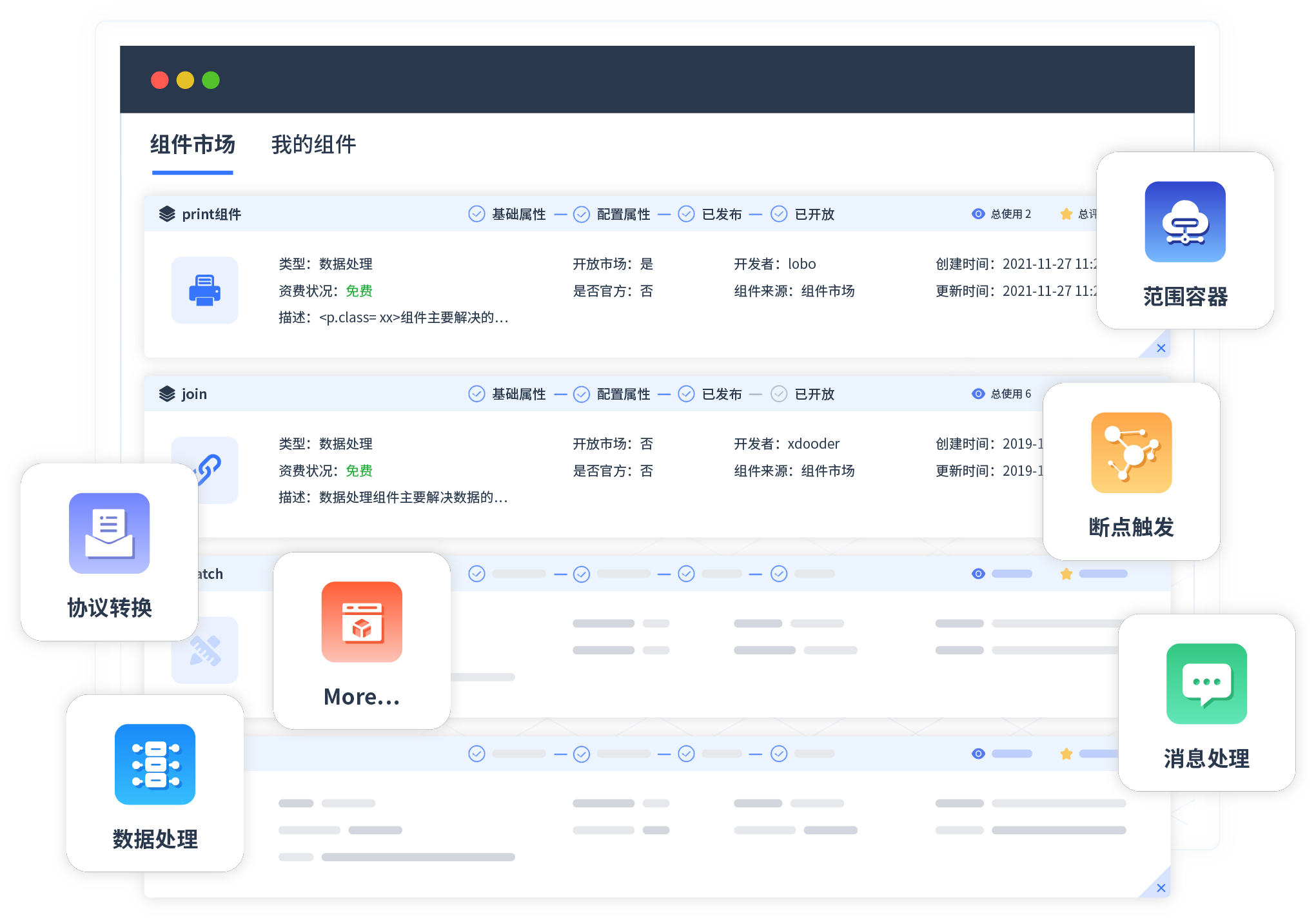 针对集成场景,竞技联盟德州提供组件市场,例如协议转换、消息处理、文件操作等。除平台提供的组件外,客户可以自定义所需组件。